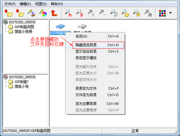 还是先把镜像文件添加进去,操作“文件”–“打开文件”。该镜像文件中有两个文件夹,我想要隐藏GIF和搞笑图这个文件夹,那么就右键单击它选择“隐藏选定目录”。