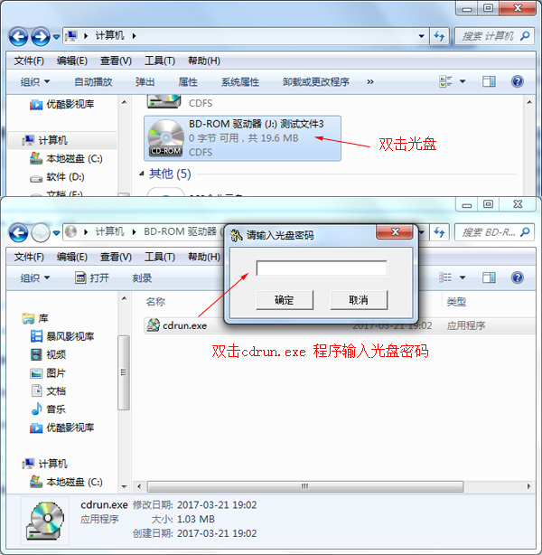 图标,双击加密好的光盘,在弹出的光盘内部情况,只有一个cdrun.exe 这个程序,双击该程序并输入设置好的密码。
