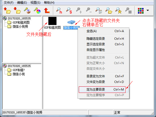 ”图标。点击另一个不进行隐藏的微信小视频文件夹,右键单击并选择“定为主要目录”。可能定为主要目录后会显示为“
