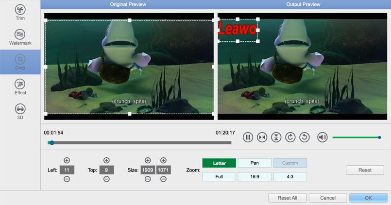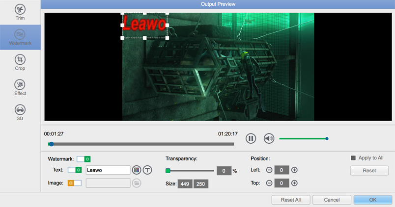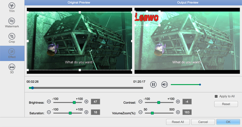內部的影片合併和影片編輯器 Leawo 藍光轉檔器Mac版可讓您個性化藍光/DVD 電影,以獲得非凡的電影享受體驗。藍光/DVD 標題可以合併為一個連續的標題,影片編輯器可以幫助修剪影片長度、裁剪影片大小、添加影片浮水印、調整影片效果以及創建 3D 影片.總之,用戶可以輕鬆獲得自己的專利視頻 Leawo 適用於 Mac 的藍光轉檔器。