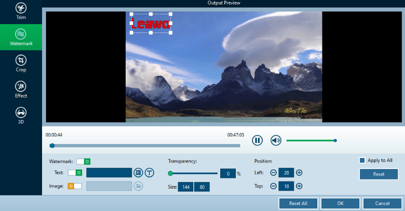 是的, Leawo 藍光轉檔軟體允許您添加圖像或文字浮水印作為您自己的簽名。它甚至允許您編輯浮水印,例如設定透明度、顏色、位置等。