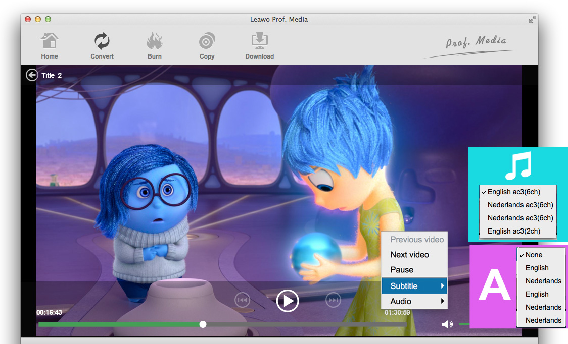 作為最好的藍光到 MKV Mac 轉檔器, Leawo Mac 版藍光轉 MKV 轉檔器可讓用戶在 MKV 輸出中完全保留所有原始字幕和音軌,這是許多其他競爭對手無法做到的。也允許自由選擇。換句話說,使用者可以自由選擇喜歡的視訊角度(僅適用於多角度藍光/DVD 來源)、字幕和音軌,包括 Dolby TrueHD 音軌(Dolby Digital TrueHD 7.1 或 5.1 環繞聲)。此外,在選擇之前,用戶可以利用內建藍光播放器預覽字幕和音軌。有了先進的藍光播放器,藍光/DVD電影預覽以及字幕和音軌預覽變得更加容易和方便,用戶可以一一預覽字幕和音軌,然後再選擇喜歡的字幕和音軌。