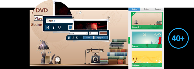 憑藉其自訂功能,Mac DVD燒錄機使用戶可以自由編輯光碟選單,例如添加標題、更改文字顏色/大小/字體以及添加背景圖像/影片/音樂。