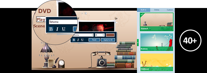 此 DVD 燒錄軟體在應用程式內為使用者提供了 40 多個光碟選單範本。使用者可以根據自己的喜好選擇自己喜歡的模板。
