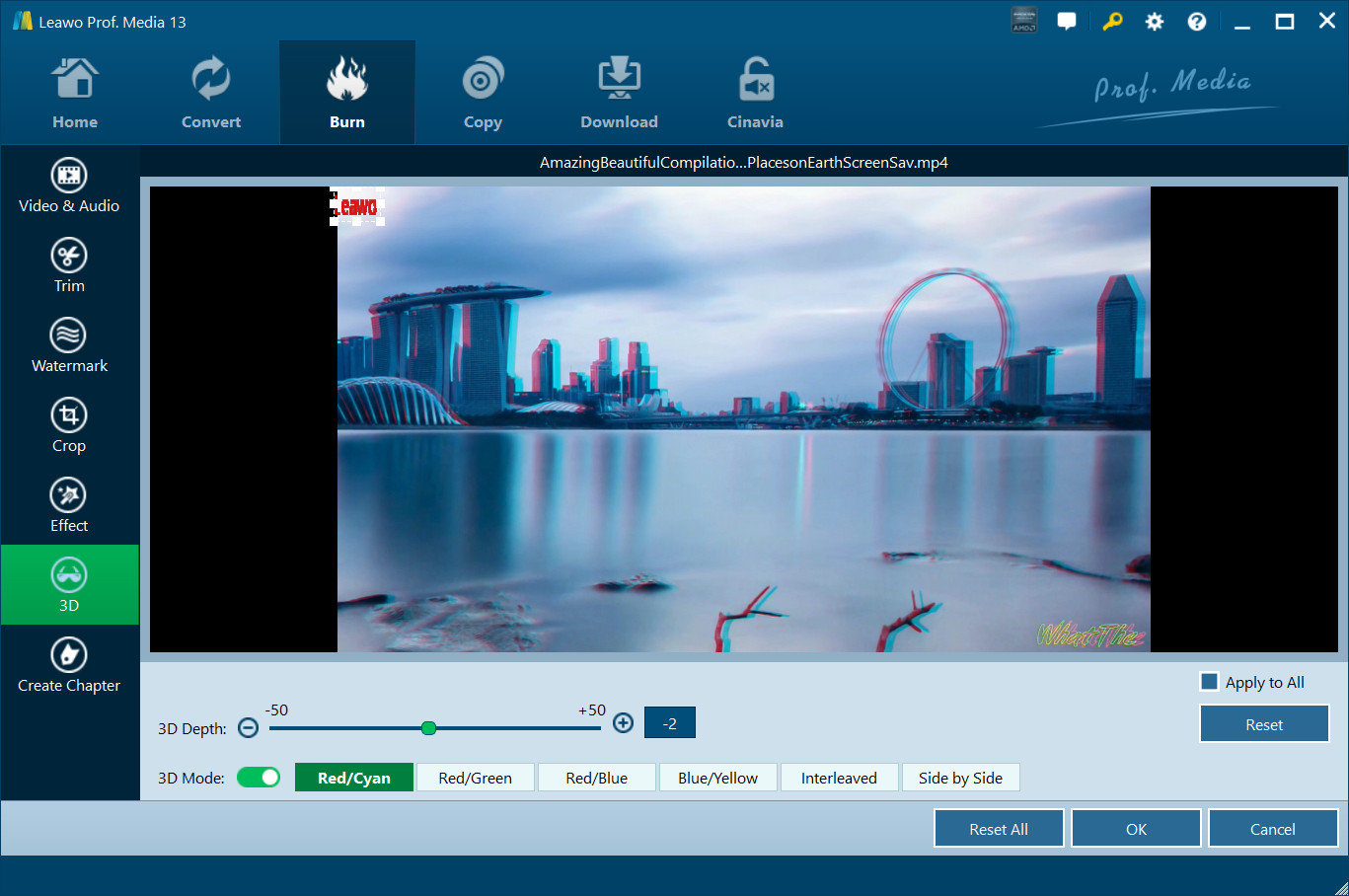 在 3D 您可以將影片從 2D 轉換為 3D。首先啟用 3D 點擊效果 3D模式 按鈕,然後選擇 3D 模式之間 紅/青色、紅/綠、紅/藍、藍/黃、交錯 並排 。而且你還可以調整 3D 透過滑動滑桿或輸入 -50 到 +50 之間的值來設定深度。