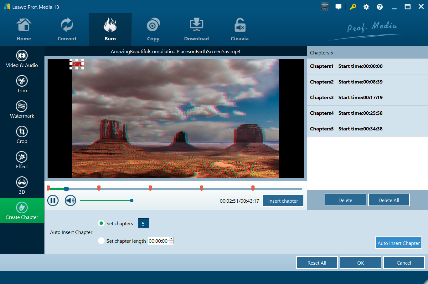 在「建立章節」標籤下,您可以建立自訂章節並將其插入光碟。點選「插入章節」按鈕可在目前播放時間建立章節。點選「刪除」按鈕可刪除章節清單側邊欄右側選定的章節,點選「全部刪除」按鈕可一次刪除所有章節。