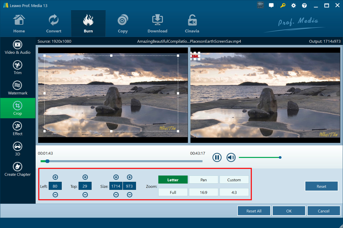 在選項卡中,您可以選擇視訊螢幕的一部分並移除其他部分。裁切影片有兩種方法:您可以直接在預覽視窗中選擇螢幕的一部分,也可以輸入左右座標和尺寸值。