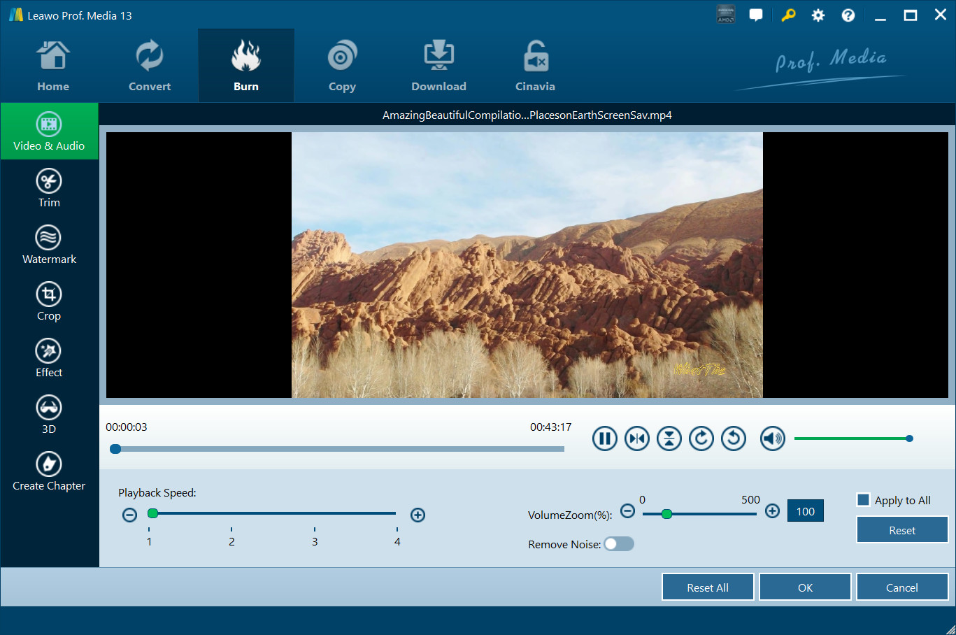 在視訊和音訊部分,您可以將輸出播放速度從 1 倍調整到 4 倍,勾選“消除噪音”,調整視訊音量縮放,以及水平翻轉、垂直翻轉、順時針旋轉 90 度或逆時針旋轉 90 度視訊。
