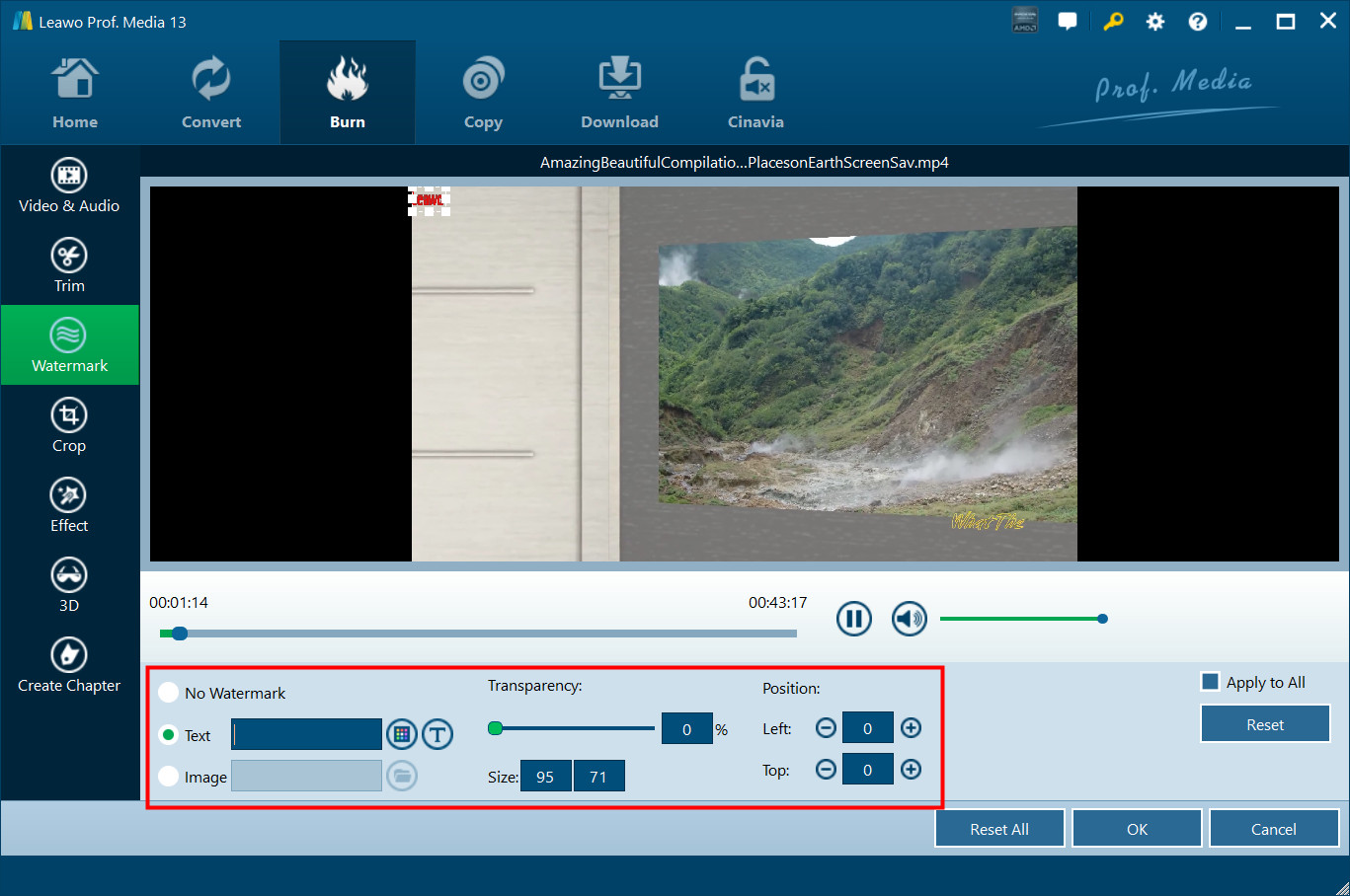 3.4 您可以透過選取將浮水印應用到匯入到該程式的所有視頻 全部應用 或點選刪除浮水印 重設 按鈕。