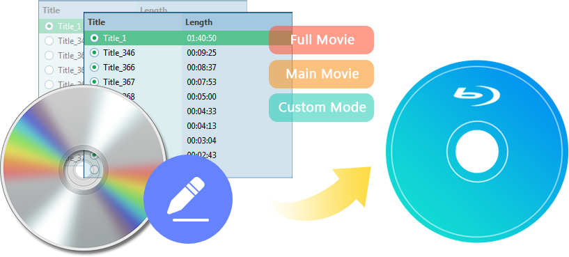Leawo DVD 到藍光轉檔器可以從一個或多個 DVD 來源載入所有或選定的標題並將其轉換為藍光內容,並啟用標題順序調整以按所需順序取得藍光內容。完整電影、主要電影和自訂模式可實現更好更快的來源 DVD 內容載入。