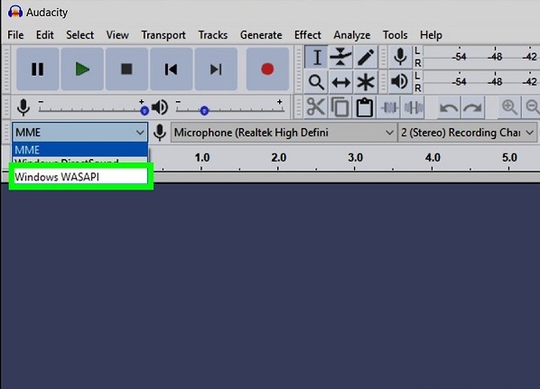 2. 在Audacity 的左上角,點擊Audio Host 下拉框,打開“Windows WASAPI”,命令Audacity 錄製Gaana.com 印地語歌曲。
