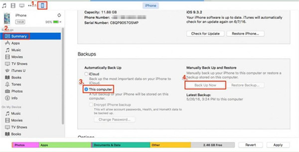 1. 將 iPod 插入電腦並啟動 iTunes。然後前往「裝置 > 摘要 > 備份 > 此電腦 > 立即備份」。您在 iPod 上的所有筆記都會備份到您的電腦上。