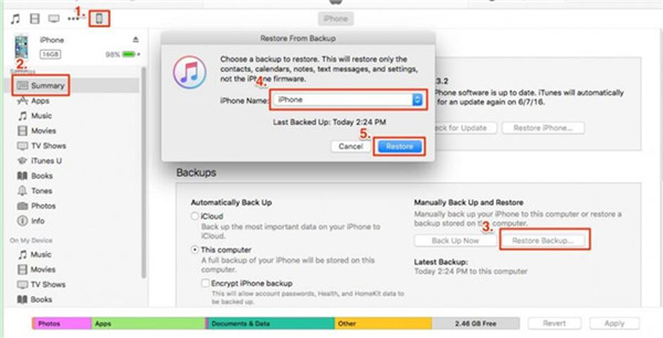 2. 備份過程完成後,將 iPhone 插入 PC。啟動 iTunes,然後點選裝置面板。導覽至「摘要 > 恢復備份」。然後您可以選擇您所做的備份,然後點擊「還原」按鈕。最後,您的所有筆記都將傳輸到您的 iPhone。