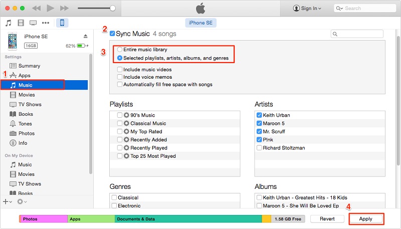 第一步: 將音樂同步到您的 iTunes。轉到“音樂”選項卡,然後點擊“應用”按鈕以在 iPad 和 iTunes 之間同步音樂。
