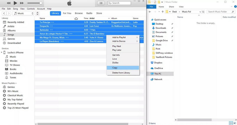 第一步: 選擇您想要傳輸的音樂文件,右鍵單擊所選音樂,然後按一下複製到。