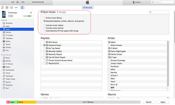 步驟3:勾選右側介面上的「同步音樂」選項,然後選擇要傳輸到iPod的音樂檔案。