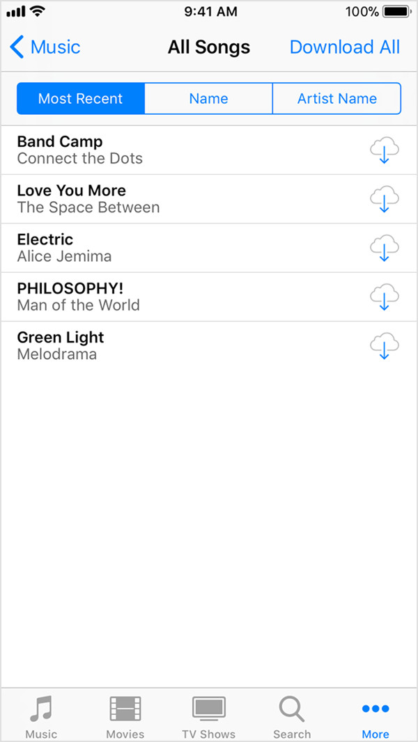 步驟 4:點選音樂標題右側的雲狀下載按鈕,將音樂下載到您的 iPod。最後您就可以在 iPod 上欣賞購買的音樂了。