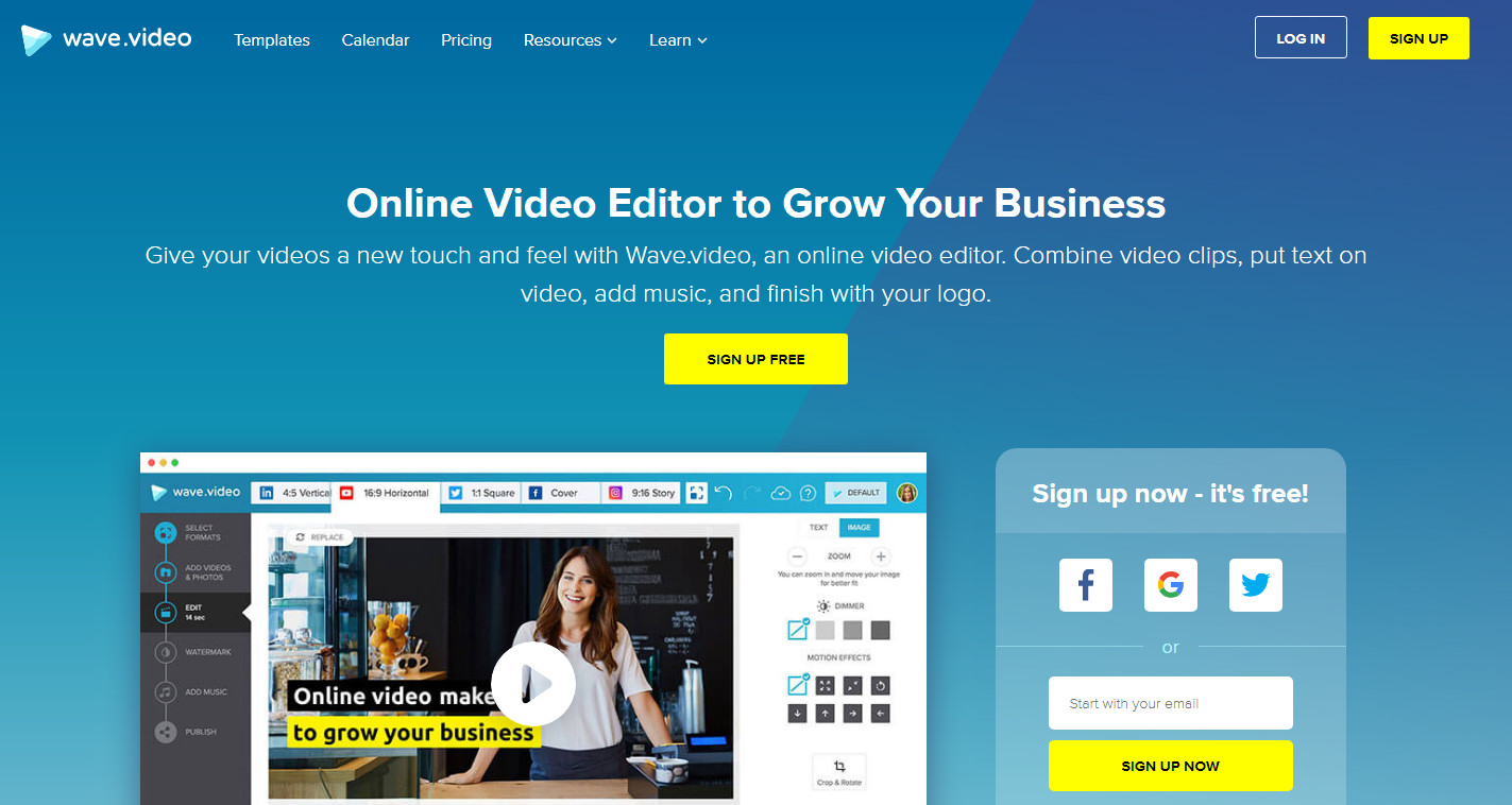 Wave.Video 是一個線上免費影片編輯器,可讓您組合影片剪輯、在影片上新增文字、新增音樂並完成標誌。它不僅使您能夠免費在線添加文字作為浮水印到影片中,還可以修剪影片長度、調暗影片效果、將多個影片剪輯合併為一個、調整影片大小等。