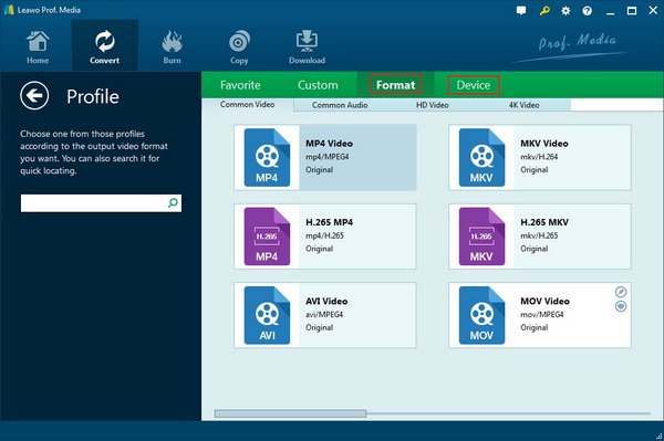 進入輸出格式變更面板後,您可以看到如下所示有「格式」和「裝置」群組,供您選擇符合您需求的群組。如果您想快速找到所需的格式,請隨時利用設定檔搜尋列。