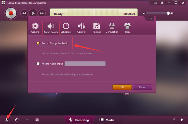 點擊麥克風圖示調出「音訊來源」窗口,然後選擇「錄製電腦音訊」選項,以滿足您的需求 下載在線音樂 至 MP3.