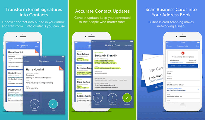 這也是一個很好的聯絡人管理應用程序,將幫助您刪除重複的聯絡人並保持電話簿乾淨。該應用程式還可以掃描名片並保存聯絡人,並且還將組織您的聯絡人。它將透過從各種社交網站提取資訊來保持您的聯絡人更新。