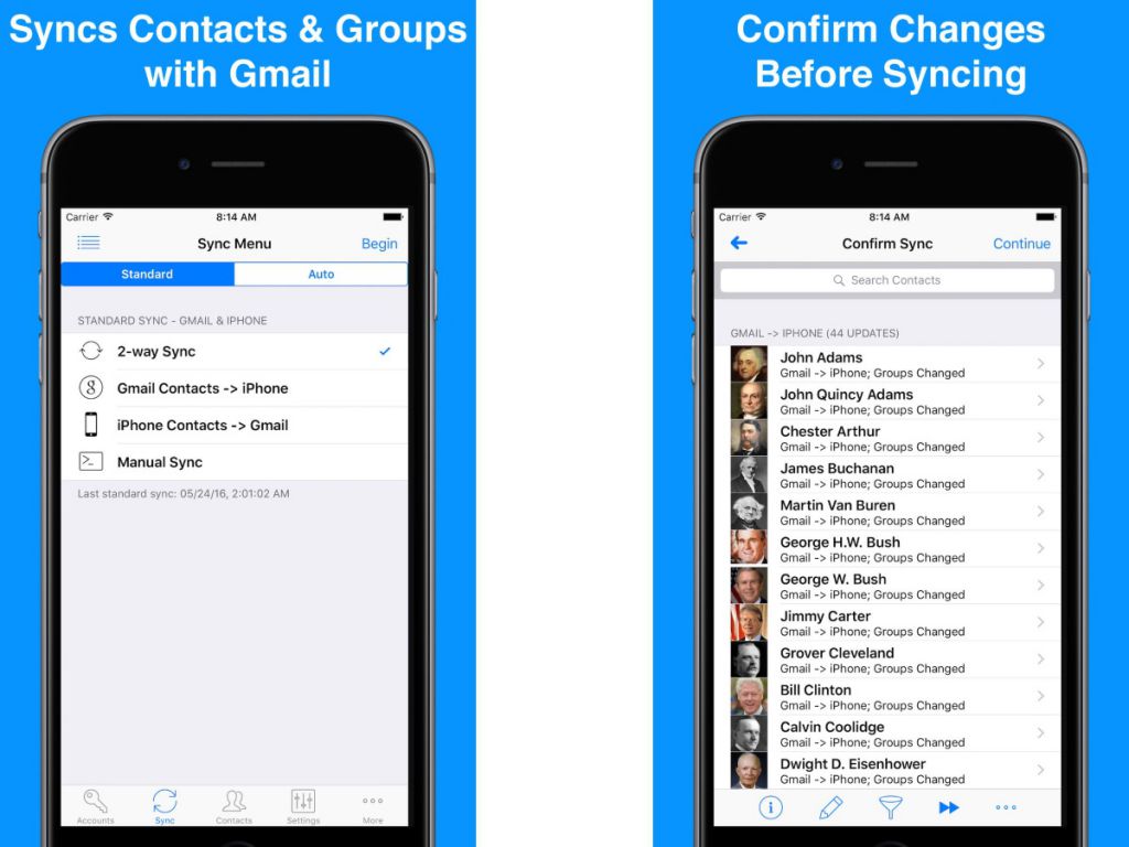 Synctastic,專為簡單而設計,支援無憂雙向 在 iPhone 和 Google 通訊錄之間同步。該應用程式具有多種同步模式,從雙向、Gmail 到 iPhone、iPhone 到 Gmail 和手動同步,該應用程式尊重各種過濾器以及聯絡人群組。使用者可以在同步開始前查看同步變更、覆蓋建議的變更、重複聯絡人以及自動聯絡人同步選項。但這個應用程式的售價為 3.99 美元。