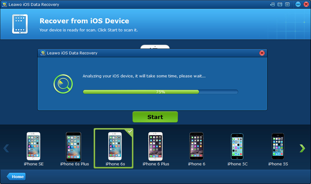 透過Apple提供的USB線將iPhone連接到電腦,然後啟動 Leawo iOS 資料復原。然後,點擊主介面上的「從IOS裝置恢復」選項 Leawo iOS 資料復原。在彈出視窗中,點擊您的 iPhone 型號,然後點擊綠色的「開始」按鈕,讓程式掃描您的 iPhone。它會分析您的 iPhone。