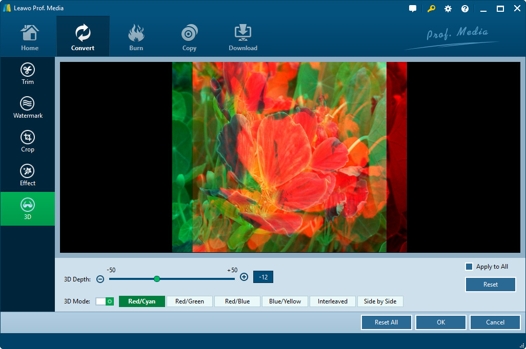 Leawo 影片轉檔器,一個內建模組 Leawo的 Total Media Transformer Ultimate Edition,提供易於使用且快速的 2D 3D 6種不同的轉換 3D 可用效果:紅/青色、紅/綠、紅/藍、藍/黃、交錯、並排。無論您的 2D 影片採用哪種格式打包,以及您想要儲存輸出哪種格式 3D 電影, Leawo 影片轉檔器滿足您的需求 180+ 2D 和 3D 支援的格式。