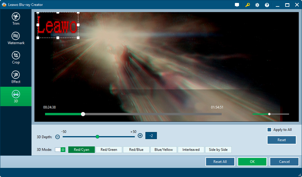 透過選擇視訊剪輯並點擊“編輯已加載視頻標題中的“圖標,您可以訪問”影片編輯”窗口,您可以在其中“修剪”視頻至精確長度、“裁剪”視頻至適當大小、“效果”視頻至最佳顯示、“水印”視頻至品牌輸出,以及在此視頻中添加“3D”電影效果到藍光燒錄機。