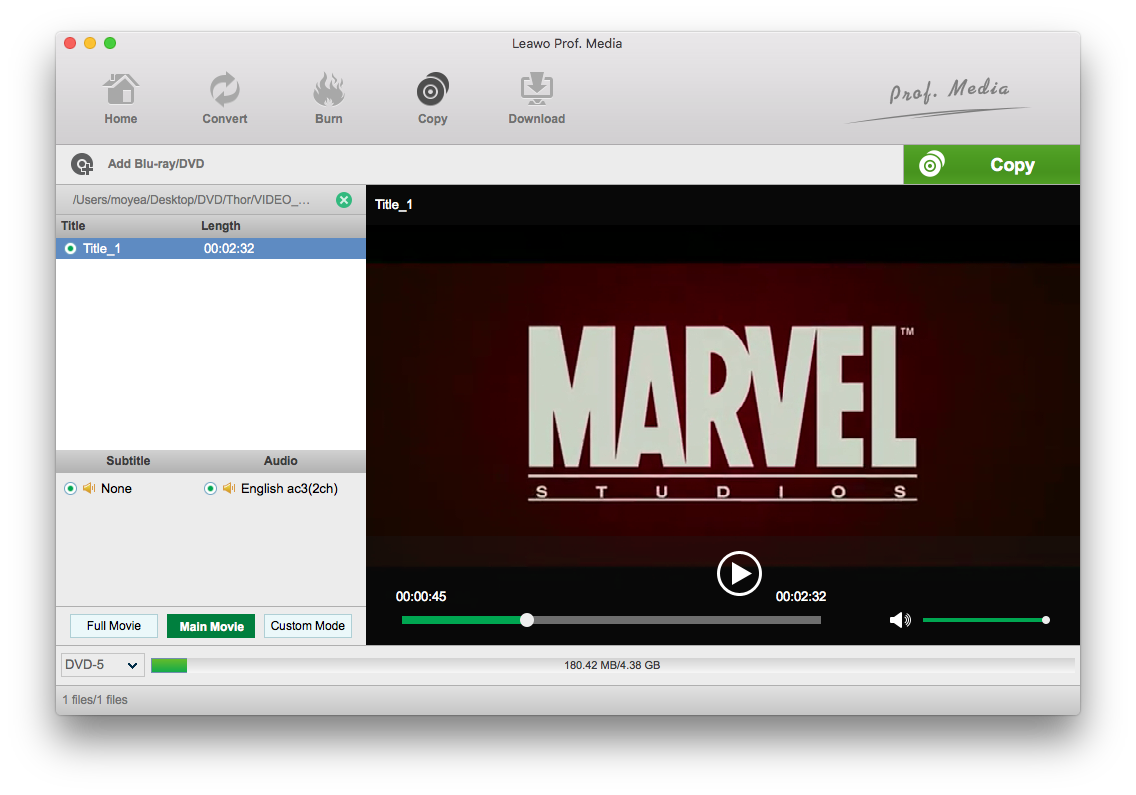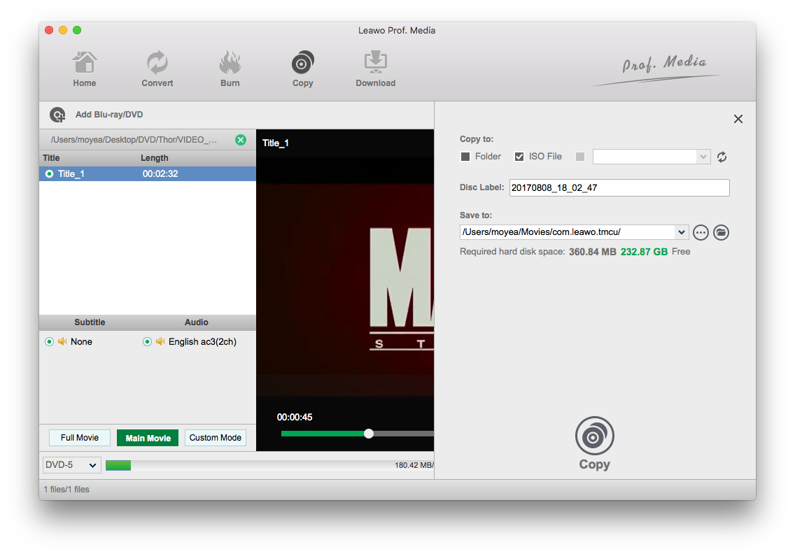 在複製介面, Leawo Mac 版 DVD 複製器為您提供 3 種複製模式 - 完整電影、主要電影和自訂模式。 完整電影模式 將複製 DVD 上的所有內容。 主要電影模式 將智慧地過濾 DVD 的開頭和結尾,僅複製主電影。 自定義模式 使您能夠從清單中選擇標題、音軌和字幕。然後,您可以將光碟類型設定為 DVD-9 到 DVD-9、DVD-9 到 DVD-5 或 DVD-5 到 DVD-5。設定完成後,您可以在右側內建預覽器中預覽複製內容。