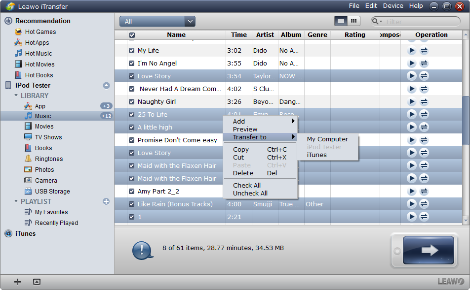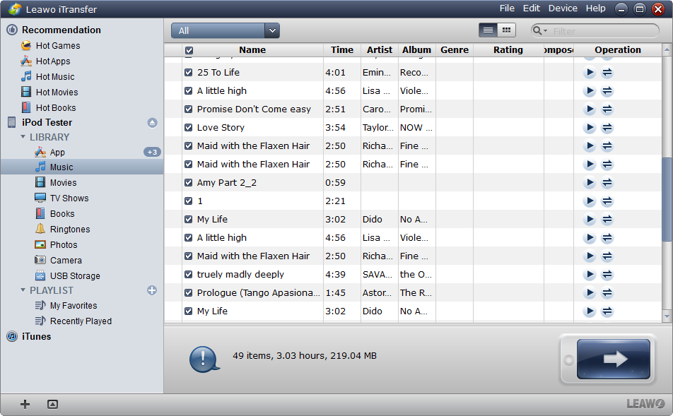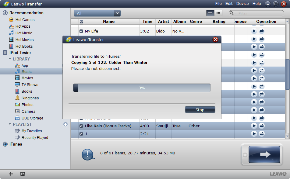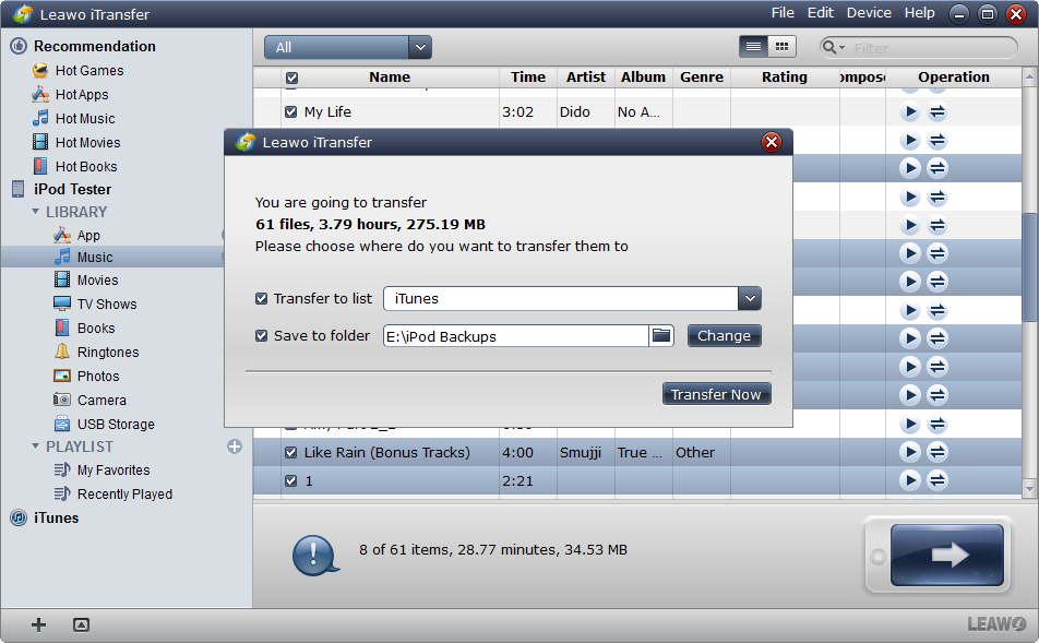該軟體是適用於iPhone、iPad和iPod的多功能傳輸軟體,有助於iOS裝置、iTunes和PC之間傳輸資料。您可以直接從 iPod 中提取音樂並將其一次發送到電腦和 iTunes 庫 Leawo iTransfer. Leawo iTransfer 還可以幫助用戶將文件添加到他們的 iOS 設備,而無需 iTunes 同步。下面的指導將告訴你 如何將音樂從 iPod 傳輸到電腦 無需iTunes,即可免費下載 Leawo iTransfer 嘗試一下。但試用版的傳輸時間有限。