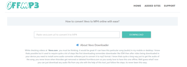 與其他第三方 iPhone 或 Android 錄音機 和下載器,關閉 MP3 Vevo Downlaoder 執行任務會更方便,因為它是一個線上下載器,無需任何進一步的下載和安裝。作為出色的音樂託管服務,Off MP3 Vevo Downloader可以快速準確地下載Vevo上的音樂和影片。通常用戶可以選擇將影片儲存在 MP3、MP4或M4A格式,滿足各種網站的大多數需求。您所需要做的就是複製您喜歡的 Vevo URL 並將其貼上到白框中,然後點擊「下載」按鈕開始下載過程。更多細節將在以下部分提供。