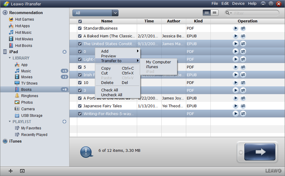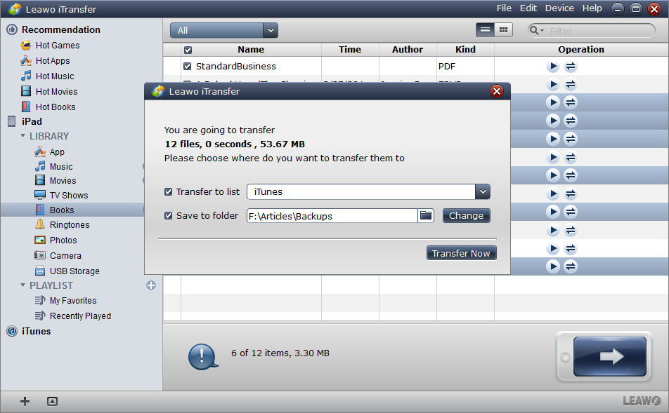 好的,現在您在閱讀 Google Play 圖書 VS iBooks 表格後已經了解了 Google Play 圖書和 iBooks 之間的差異。如果您在 iPhone iBooks 上儲存了一堆書籍並希望將它們從 iBooks 傳輸到 Google 雲端硬碟,該怎麼辦?別緊張, Leawo iTransfer 會幫你一個忙。方便且易於利用,可用於 傳輸或備份照片iOS 裝置、iTunes 和電腦之間的、影片、電影、應用程式、簡訊等。當您啟動軟體時,您會被其易於操作的介面所震驚。即使是新手,您也可以輕鬆掌握如何使用它。要將圖書從 iBooks 轉移到 Google Drive 圖書,您可以按照以下步驟進行操作。