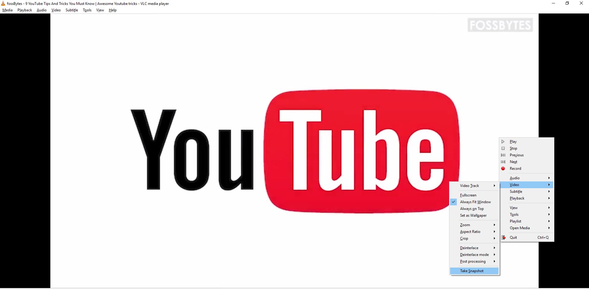 幸運的是,使用列印螢幕方法捕獲視訊快照並不總是最好的選擇 VLC 對此也有規定。要拍攝快照,只需右鍵單擊,請轉到“影片”>“拍攝快照”。您也可以簡單地使用鍵盤快速鍵 SHIFT+S(Windows/Linux 上)或 CMD+ALT+S(OS X 上)。