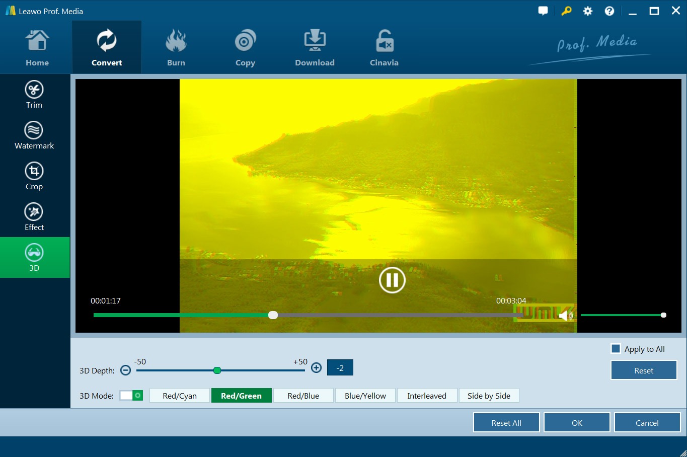 其實, Leawo 藍光轉換器可以轉換 3D 藍光電影到 3D 6種不同的影片文件 3D 影片效果:紅/青色(浮雕)、紅/綠、紅/藍、藍/黃、交錯和並排。點擊每個載入的藍光標題中的編輯圖示進入編輯面板,然後打開 3D 左側面板上的選項卡。將“3D 模式”滑動到綠色。然後您可以選擇紅色/青色作為輸出 3D 效果,然後調整 3D 深度依自己的需要。您可以透過內部播放器獲得即時預覽。