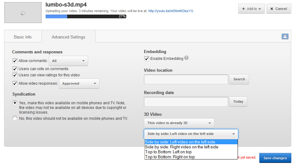 - 上傳影片時,請點擊“進階設定”按鈕,然後從“此影片已經是 3D”中選擇“此影片已經是 XNUMXD” 3D 影片選擇列表。