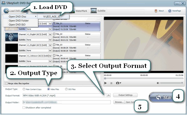 - 載入來源 DVD 電影後,您可以選擇字幕、音軌、播放載入的 DVD 標題、將 DVD 標題合併為一個等。