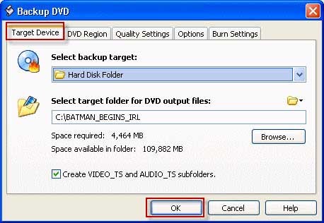 步驟3.完成上述設定後,點擊頂部中央的“備份”,您將看到下面的備份DVD視窗。選擇您想要儲存檔案的輸出位置,然後按一下「確定」開始使用 DVD Shrink 備份 DVD。