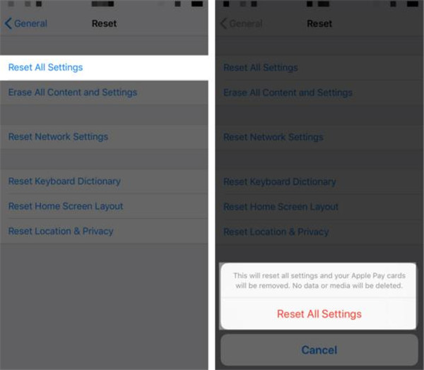 首先,您需要嘗試重置所有設置,這將使設置應用程式中的所有內容恢復為出廠預設值。您應該做的是打開“設定”,然後點擊“常規”,然後選擇“重置”並點擊“重置所有設定”。之後,出現確認提示後,點選「重設所有設定」選項。