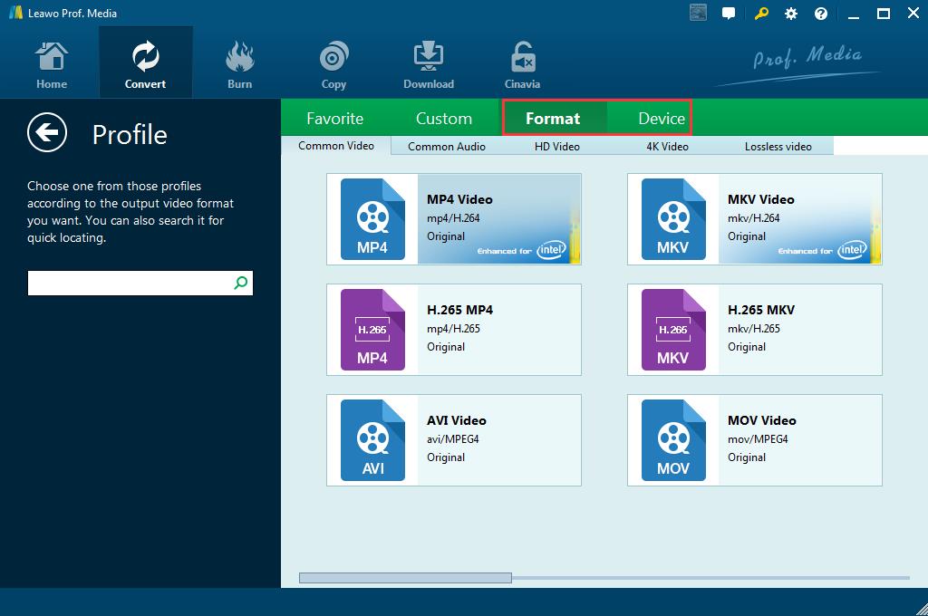 請點選綠色「轉換」按鈕旁的「MP4 影片」按鈕。您將看到一個小面板。然後點擊“更改”進入“個人資料”面板。您可以在「格式」或「裝置」群組下選擇視訊/音訊格式或行動裝置作為輸出設定檔。多種視訊/音訊格式(包括MP4、MKV、F4V、MOV、AVI、RMVB、FLV、VOB…)和裝置型號可供選擇,如iPhone X、iPad Air、Sony、三星、HTC、摩托羅拉等Android手機等。