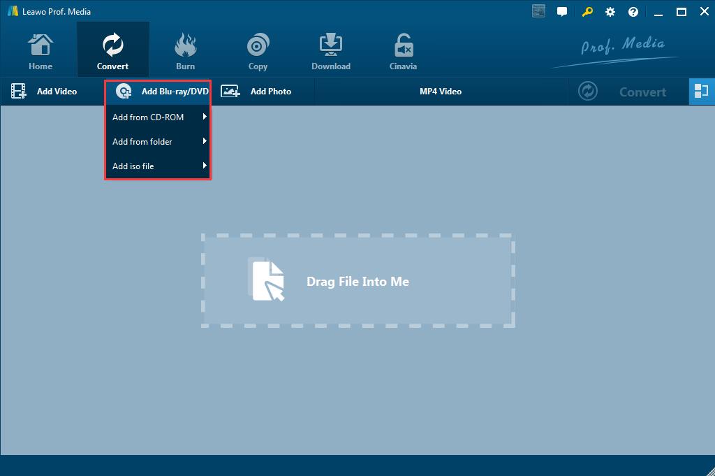 點擊“轉換”按鈕下方選單上的“新增藍光/DVD”按鈕。在下面的下拉式選單中,選擇“從 CD-ROM 新增”,您將在下面的選單中看到光碟的名稱。