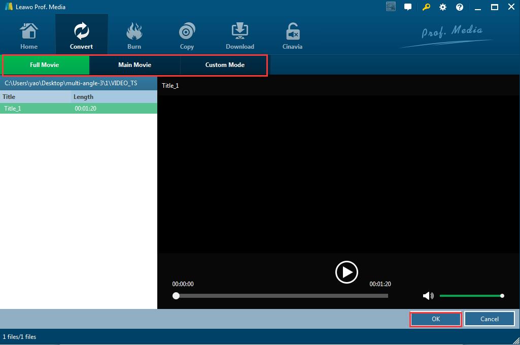 將DVD 光碟中的影片內容新增至程式後,您可以選擇「轉換」按鈕下方的三個選項(「完整影片」、「主要影片」或「自訂模式」)之一來選擇DVD 光碟中的視訊。完整電影應該導入所有標題,而主電影僅導入最長的標題,而自訂模式允許您自由選擇標題。選擇一種模式並根據需要選擇標題,然後按一下右下角的「確定」即可完成。