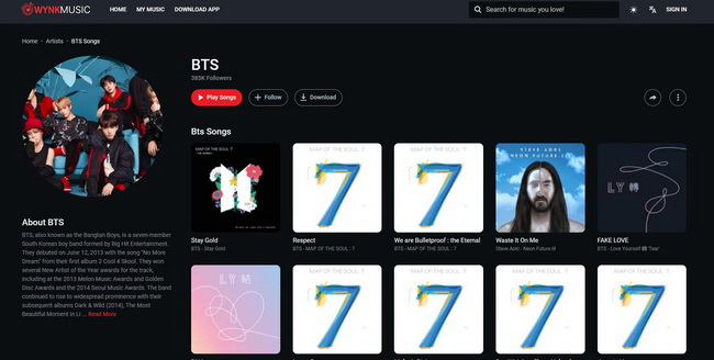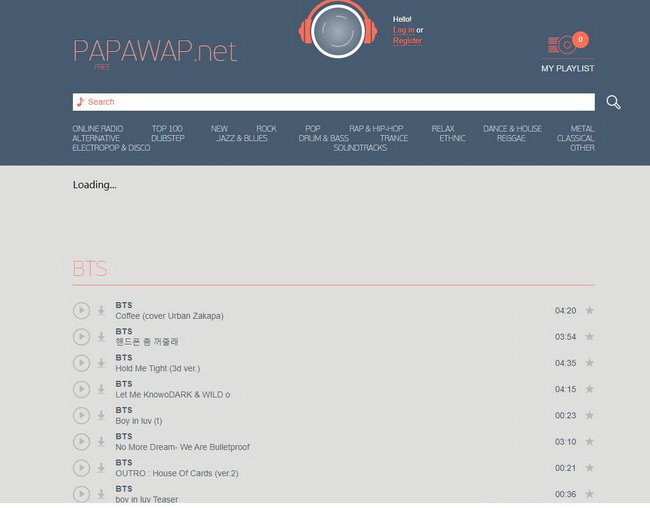 這是您可以參考的第一個優秀的 BTS 歌曲下載網站。作為最古老的下載網站之一,PAPAWAP包含了不同階段的各類BTS歌曲。但它只提供了 BTS 歌曲的列表,沒有有關歌曲的進一步資訊。此外,螢幕最上方有一個搜尋欄,允許用戶搜尋您的目標歌曲。找到歌曲後,用戶只需點擊下載按鈕即可取得 BTS 歌曲 MP3 下載。