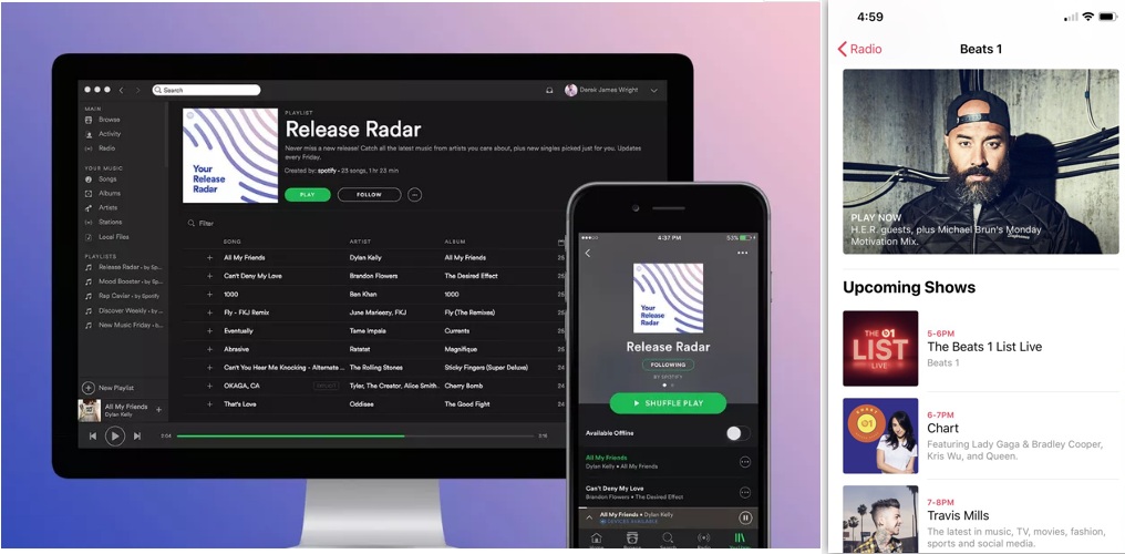 對於音樂發現,Apple Music 和 Spotify 都根據您喜歡的內容為您提供最新的播放清單。 Apple Music 會透過其最愛混音和新音樂混音來回應您,此外,Apple Music 還有一個名為 Beats1 Radio 的獨立電台,該電台由實際 DJ 策劃和主持,因此您可以即時收聽。不過,它會發現新的或未發行的曲目。 Spotify 提供每週發現和發布雷達播放清單來收集您未聽過的音樂以及符合您收聽習慣的新發佈曲目。