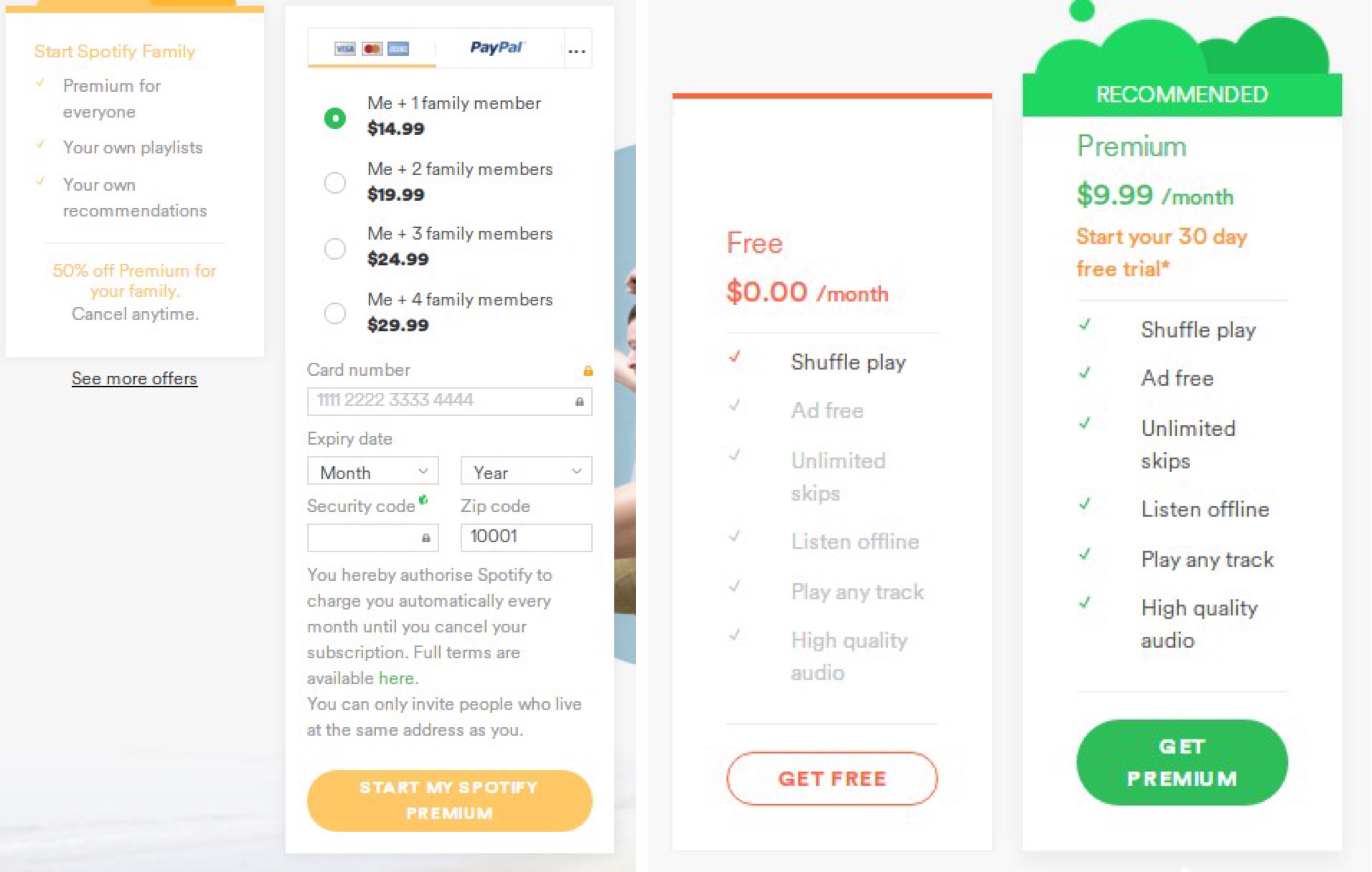 Spotify 允許用戶免費收聽音樂,但有限制和廣告,而 Apple Music 則需要付費。儘管如此,Apple Music 或 Spotify 的付費訂閱者還是支付了相同的價格。如果您每月支付 9.99 美元升級到 Spotify Premium,您將可以下載您喜歡的歌曲並聆聽沒有廣告的音樂。此外,他們還提供僅需 4.99 美元的學生折扣和 6 個帳戶的家庭套餐,僅需 14.99 美元。因此,這是 Spotify Premium 與 Adple Music 的價格對比。