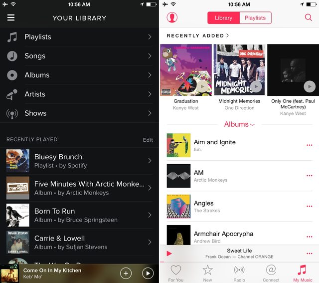 Apple Music 擁有 iCloud 音樂庫,因此 MP3 收藏家無論走到哪裡都可以訪問他們的圖書館。雖然 Spotify 應該讓你聽你的 MP3s 在應用程式本身內,也沒有上傳曲目的權限。