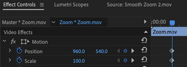 步驟 3. 設定縮放的起點。 為了以適當的比例放大影片並獲得適當的效果,您需要打開“效果控制”面板,輸入“比例”和“位置”參數。如何確定「尺度」和「位置」?您可以記錄您喜歡的確切起點和終點,然後確認「縮放」量。