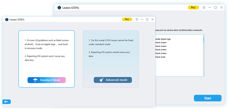Leawo iOSFix 提供2種系統修復模式:標準模式與進階模式。標準模式提供資料無損解決方案來修復 iOS/tvOS 系統問題,而進階模式則徹底修復 iOS/tvOS 系統。您可以硬重置 iPhone,而不會遺失任何資料。