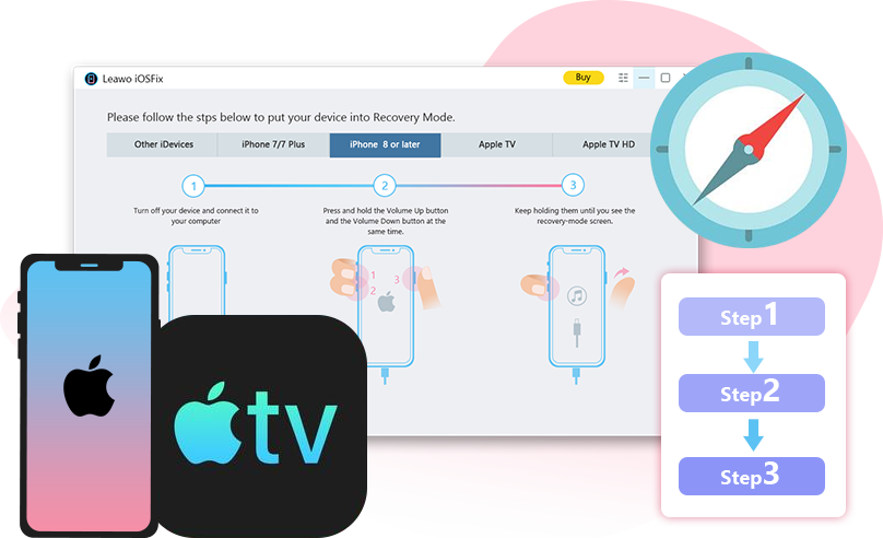 作為最好的iOS系統恢復, Leawo iOSFix 可以修復 50 多個 iOS/tvOS 問題,例如 Apple 標誌、黑屏、卡在 DFU 模式、iPhone 不斷重新啟動、iPhone 無服務等。根據裝置版本智慧列出最佳韌體更新。只需點擊幾下即可修復 iOS 系統。