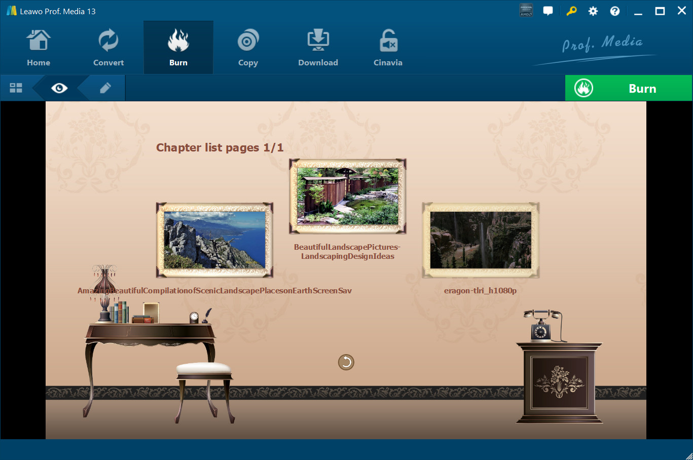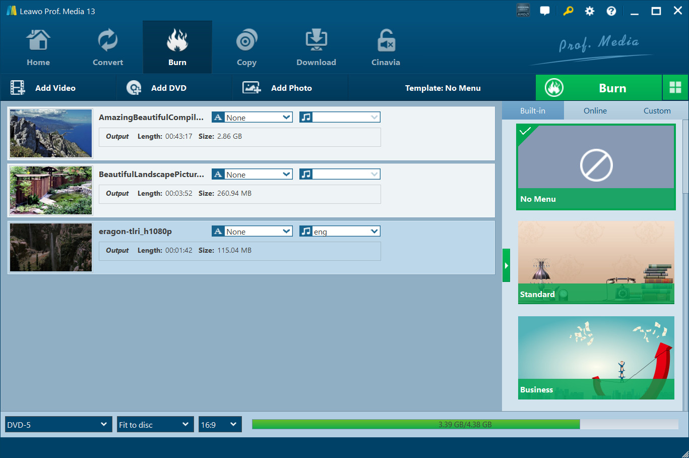 特色 UHD燒錄機、藍光燒錄機、DVD 到藍光轉檔器和 DVD 燒錄機、 Leawo Prof. Media 13 幫助您輕鬆轉換和刻錄視頻 4K Blu-ray/Blu-ray/DVD,將DVD轉換為藍光,並提供一鍵操作將ISO映像檔燒錄到 4K 藍光/藍光/DVD 光碟。在這個 Leawo Prof. Media 13 在使用者指南部分,您將學習如何使用 Burn 模組。 Leawo Prof. Media 13.